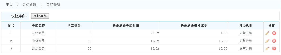 快速消費(fèi)會(huì)員等級(jí)信息:快速消費(fèi):會(huì)員在此等級(jí)時(shí),快速消費(fèi)所能享受的消費(fèi)折扣. 積分:會(huì)員在此等級(jí)時(shí),快速消費(fèi)時(shí)自動(dòng)兌換的積分比率,如:消費(fèi)10元得1積分|消費(fèi)20元得1積分|消費(fèi)50元得1積分。