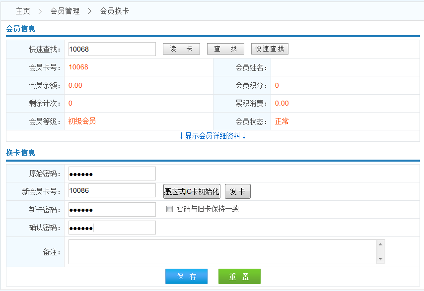 2.本操作用于會員更換新卡操作,換卡支付費用不在卡內(nèi)扣款,要收取現(xiàn)金.