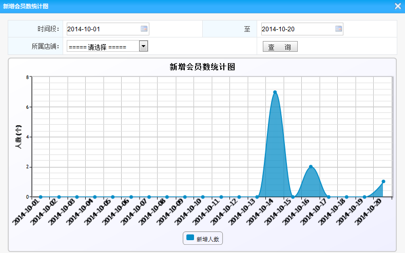 會員信息統(tǒng)計: 1.統(tǒng)計圖:將符合條件的數(shù)據(jù)以統(tǒng)計圖形式展現(xiàn)出來 (如下圖) 2.導(dǎo)出:將按條件查詢到的數(shù)據(jù) 導(dǎo)出成Excel表格 3.查詢:按照條件查詢出數(shù)據(jù)(例如 根據(jù)會員的店鋪會員的等級等)