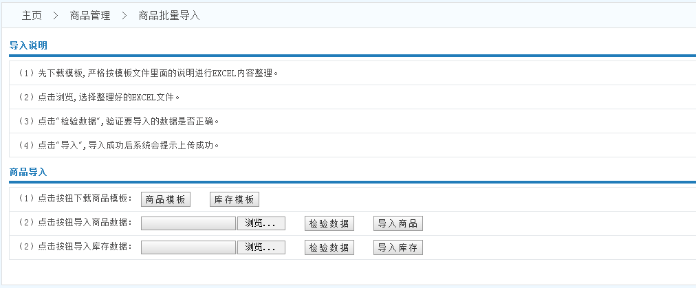 商品模板------>錄入數(shù)據(jù)------>點擊瀏覽------>檢驗數(shù)據(jù)------>導入商品------>導入成功
