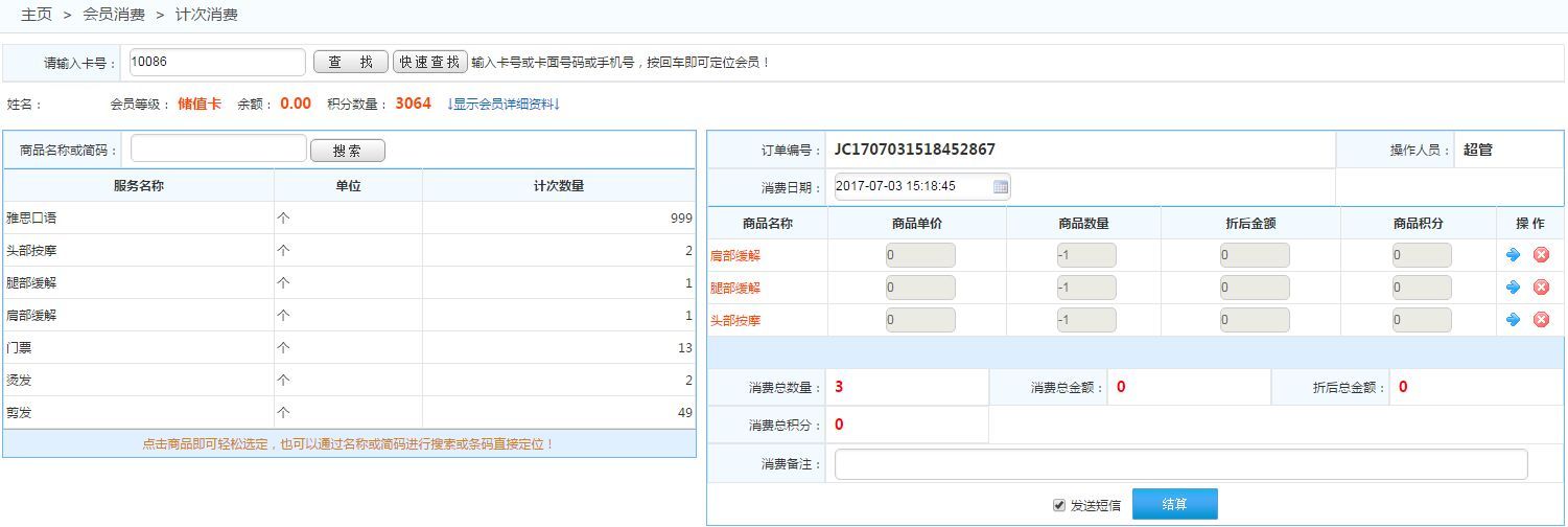 通過刷卡,或者通過查詢定位到會員,然后在左側(cè)選擇服務(wù)類型商品進(jìn)行計(jì)次消費(fèi) 如下圖: