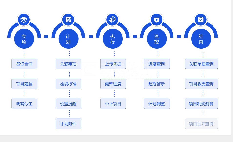 系統(tǒng)中支持查詢:項(xiàng)目進(jìn)度(含關(guān)聯(lián)單據(jù))、項(xiàng)目資金收支情況、項(xiàng)目利潤(rùn)測(cè)算情況、項(xiàng)目損益表(財(cái))。